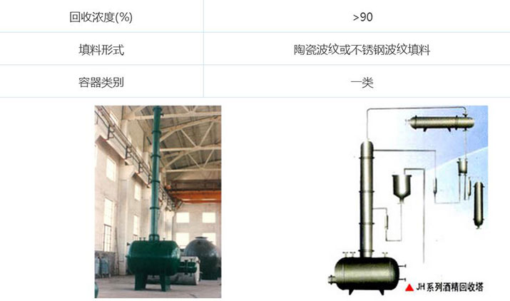酒精回收塔由塔釜、塔身、冷凝器、冷卻器、緩沖罐、高位貯罐六個部分組成,可用于制藥、食品、化工等行業的稀酒精回收,本設備與物料部分均采用0Cr18Ni9不銹鋼制造,具有良好的耐腐蝕性能,經久耐用